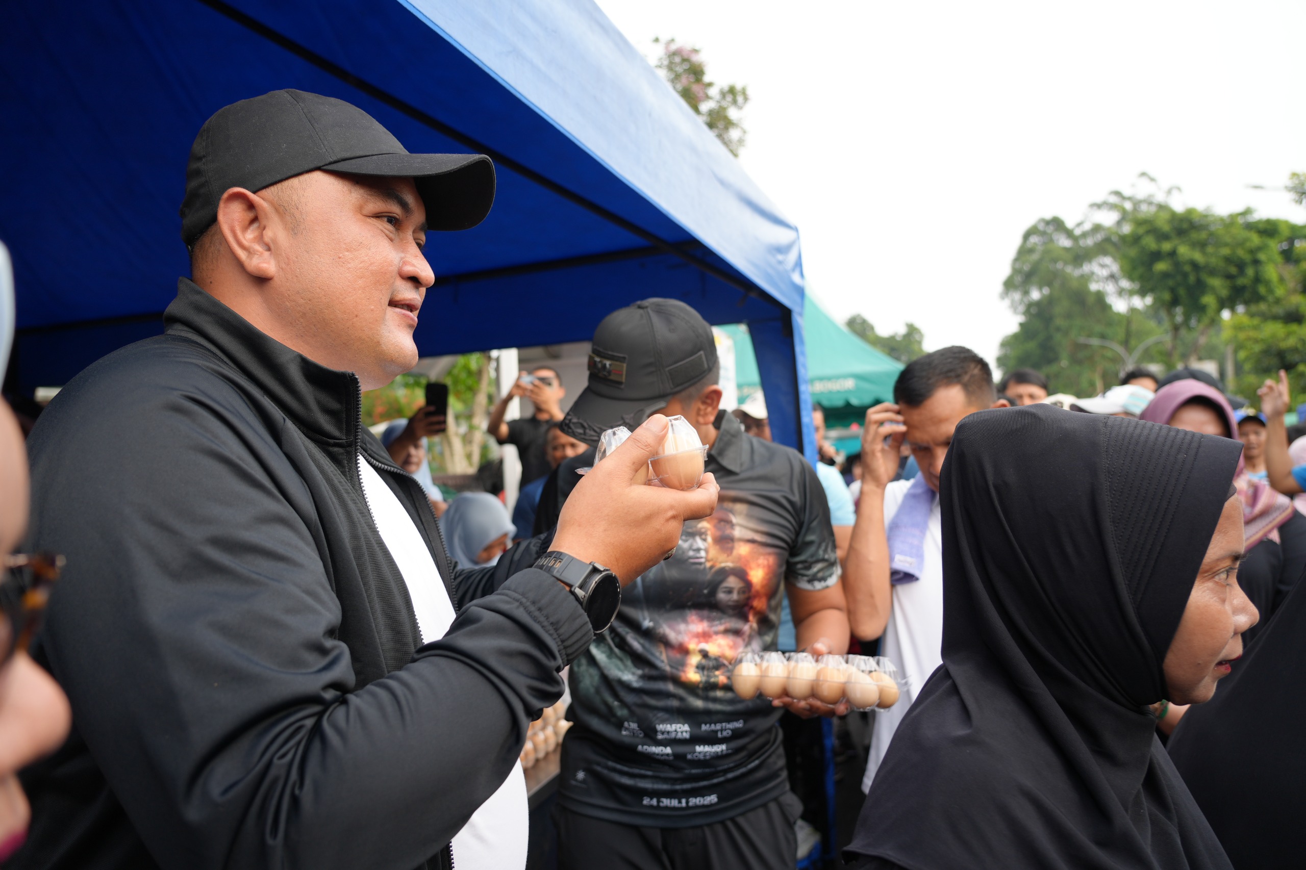 Cibinong –Bupati Bogor Rudy Susmanto membagikan 2.025 paket telur dan 1.500 paket telur rebus siap konsumsi kepada masyarakat yang hadir pada gelaran Car Free Day (CFD) Tegar Beriman dalam Kampanye Gerakan Makan Telur yang di prakarsai oleh Dinas Perikanan dan Peternakan pada Minggu pagi, 23 November 2025. Kegiatan ini turut dihadiri oleh Wakil Bupati Bogor, Sekretaris Daerah Kabupaten Bogor, Ketua DPRD Kabupaten Bogor, Dandim 0261, Ketua Pengadilan Agama, serta seluruh Kepala Satuan Perangkat Daerah (SKPD). Pembagian telur tersebut menjadi bagian dari upaya meningkatkan kesehatan serta gizi masyarakat.