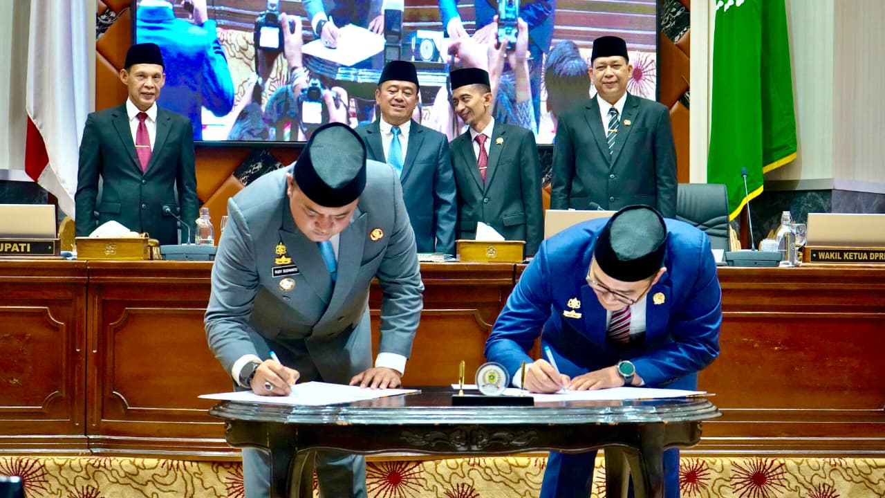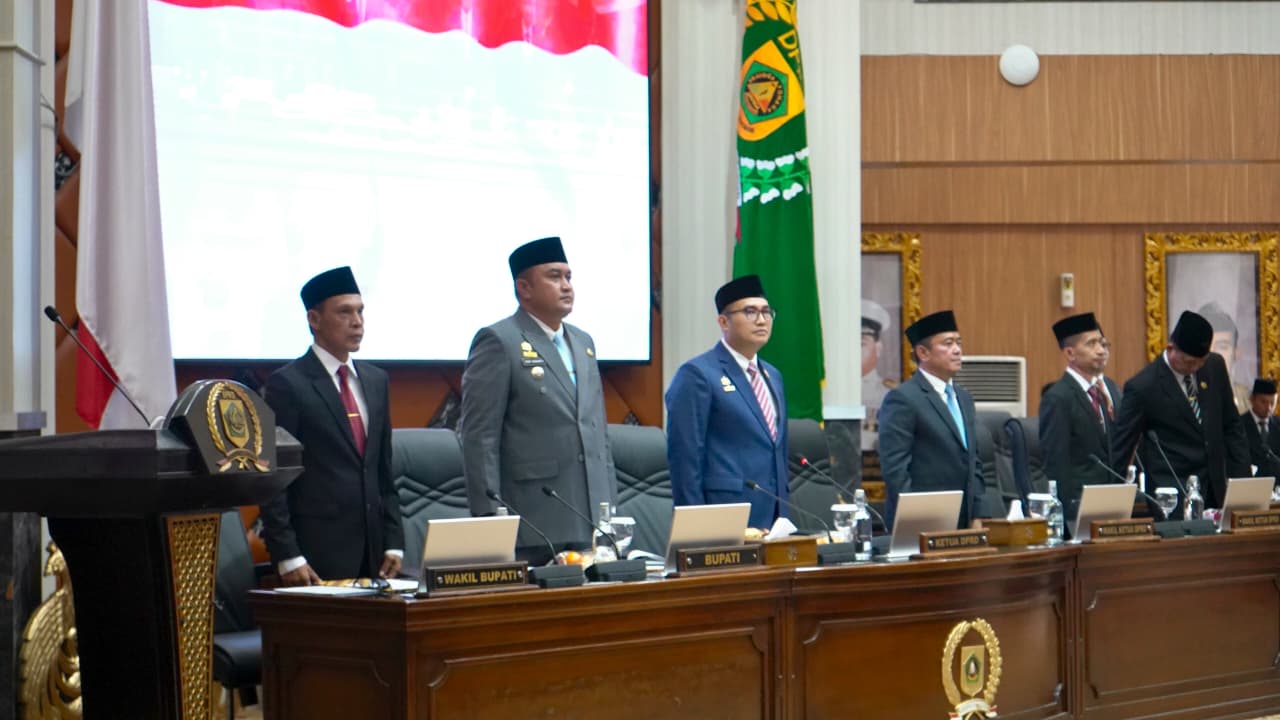 Cibinong – Bupati Bogor Rudy Susmanto, bersama Ketua DPRD Kabupaten Bogor Sastra Winara, melaksanakan Rapat Paripurna DPRD Kabupaten Bogor yang berlangsung di ruang rapat DPRD, Selasa (21/10/25). Rapat tersebut membahas penyampaian dan tanggapan terhadap beberapa Rancangan Peraturan Daerah (Raperda).