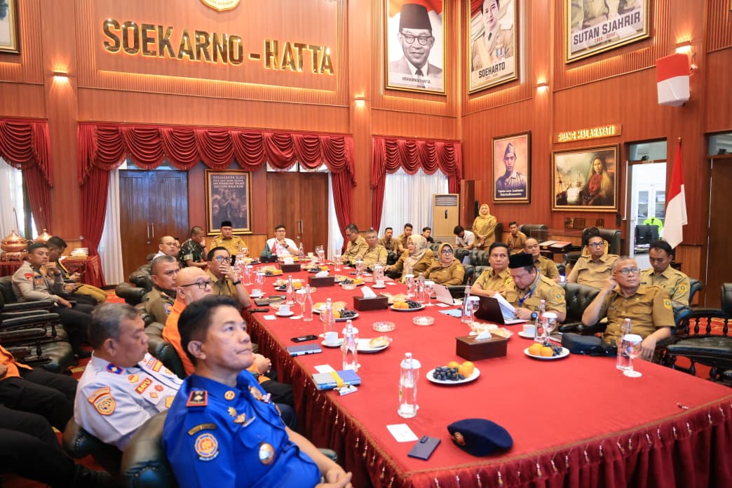Cibinong- Bupati Bogor, Rudy Susmanto, bersama Forum Koordinasi Pimpinan Daerah (Forkopimda) serta jajaran Pemerintah Kabupaten Bogor, mengikuti Rapat Koordinasi Pusat dan Daerah yang dipimpin Menteri Dalam Negeri Republik Indonesia, Tito Karnavian, secara virtual dari Ruang Soekarno Hatta, Pendopo Bupati Bogor, pada Senin (1/12/25). Rakor ini digelar untuk memastikan kesiapsiagaan nasional dalam menghadapi potensi bencana, serta persiapan pengamanan perayaan Natal 2025 dan Tahun Baru 2026 (Nataru).