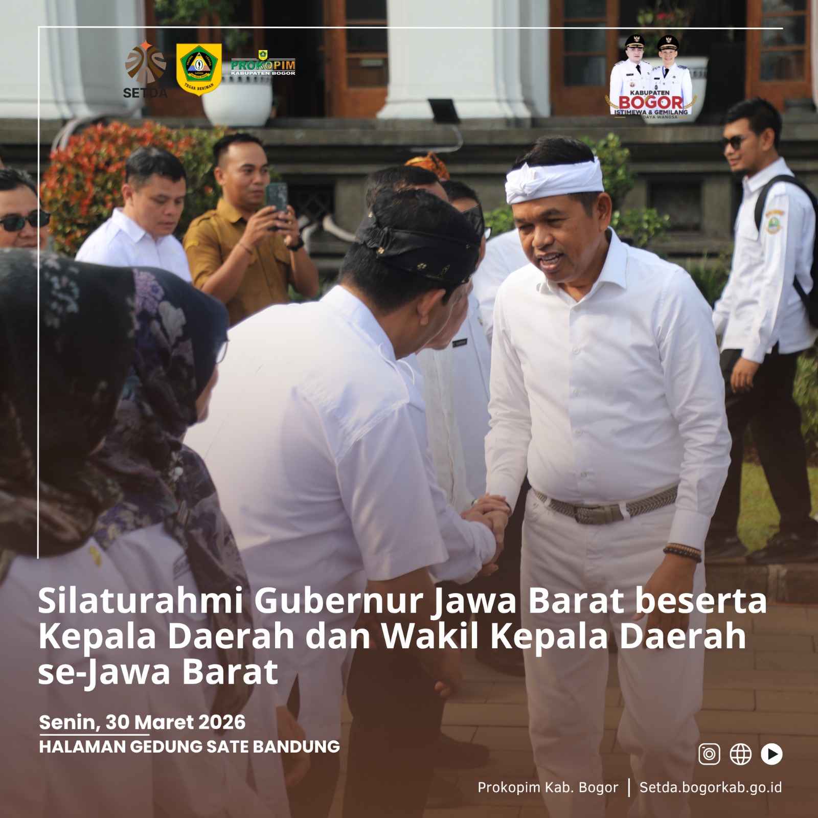 Bandung – Bupati Bogor Rudy Susmanto menghadiri kegiatan silaturahmi bersama Gubernur Jawa Barat Dedi Mulyadi serta para Kepala Daerah dan Wakil Kepala Daerah se-Jawa Barat. Kegiatan tersebut berlangsung dalam suasana hangat, penuh kebersamaan dan semangat persatuan di halaman Gedung Sate, Senin (30/3/2025).
