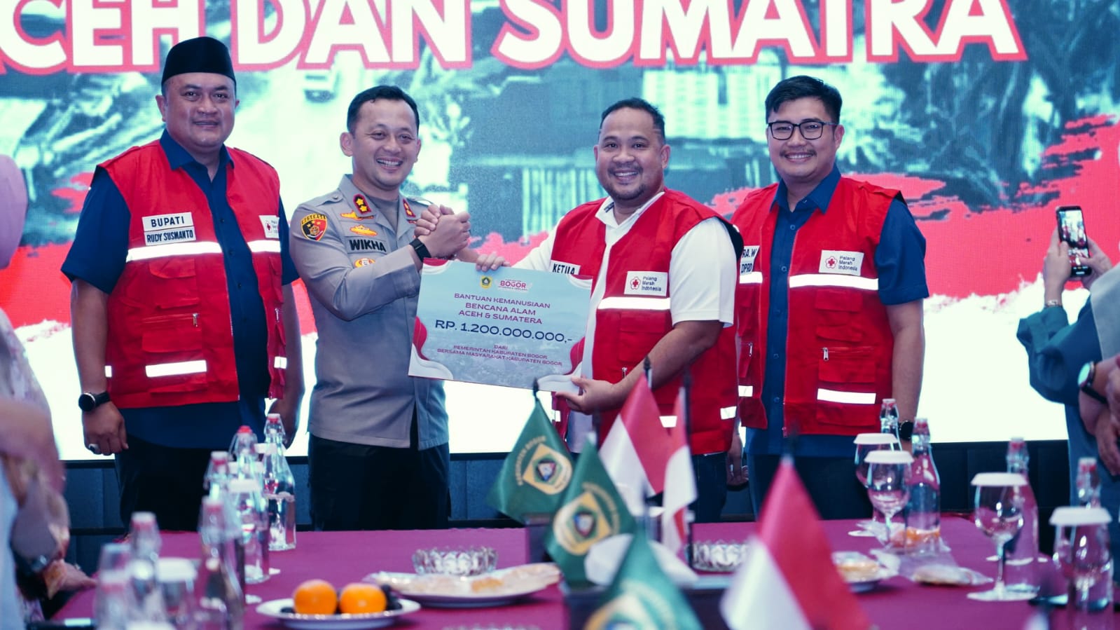 Cibinong— Bupati Bogor, Rudy Susmanto, secara resmi menyerahkan bantuan kemanusiaan senilai Rp1,2 miliar kepada Palang Merah Indonesia (PMI) Kabupaten Bogor untuk membantu penanganan bencana alam di Aceh dan Sumatera. Penyerahan berlangsung di Ruang Soekarno-Hatta, Pendopo Bupati Bogor, pada Selasa (9/12/25).