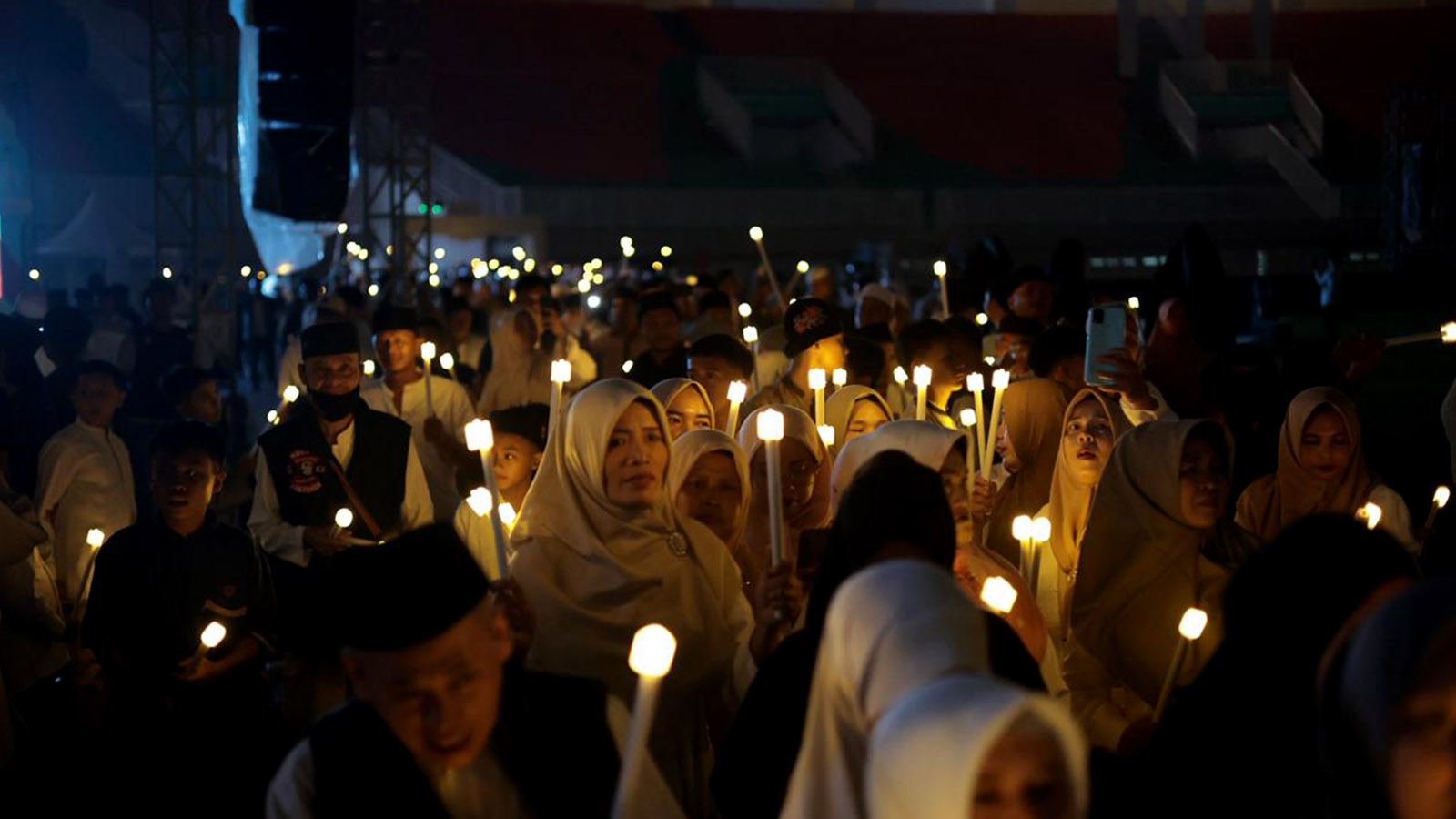 “Jangan lupa, Esok hari, Tanggal 21 Maret 2026, Pukul 06.45, Waktu Indonesia Bagian Barat. Mari kita berkumpul bersama, Melaksanakan sholat idul fitri bersama-sama, Tumpah ruah menjadi satu, Tidak ada pimpinan, Tidak ada bawahan di hadapan Allah.”