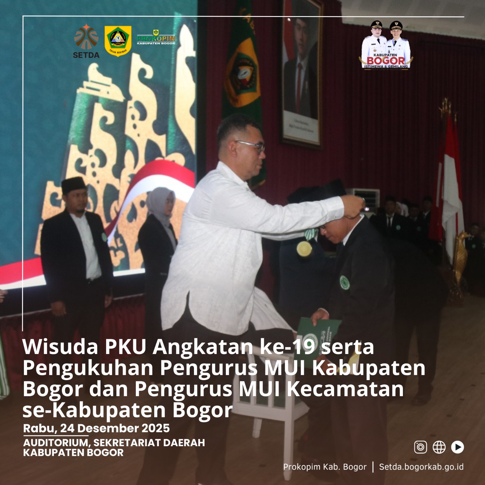 Cibinong – Majelis Ulama Indonesia (MUI) Kabupaten Bogor terus memperkuat perannya dalam pembinaan umat dan pembangunan daerah melalui Wisuda Pendidikan Kader Ulama (PKU) Angkatan ke-19 serta Pengukuhan Pengurus MUI Kabupaten Bogor dan Pengurus MUI Kecamatan se-Kabupaten Bogor, yang berlangsung di Gedung Auditorium Sekretariat Daerah Kabupaten Bogor, Rabu (24/12/2025).