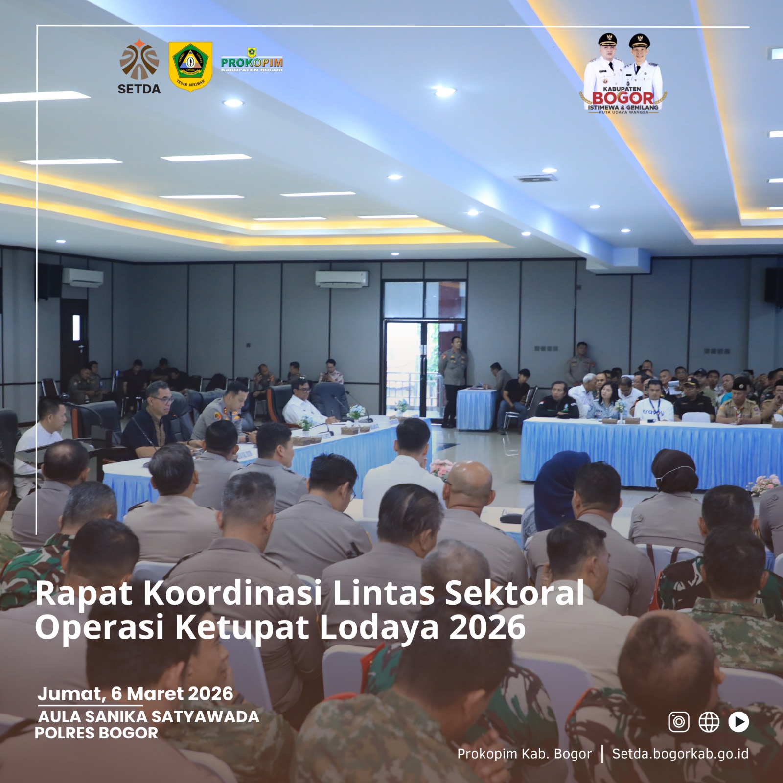 CIBINONG - Pemerintah Kabupaten Bogor bersama Polres Bogor dan jajaran Forkopimda memperkuat koordinasi lintas sektor dalam rangka pelaksanaan Operasi Ketupat Lodaya 2026 guna memastikan keamanan dan kelancaran arus mudik serta perayaan Idul Fitri di wilayah Kabupaten Bogor.