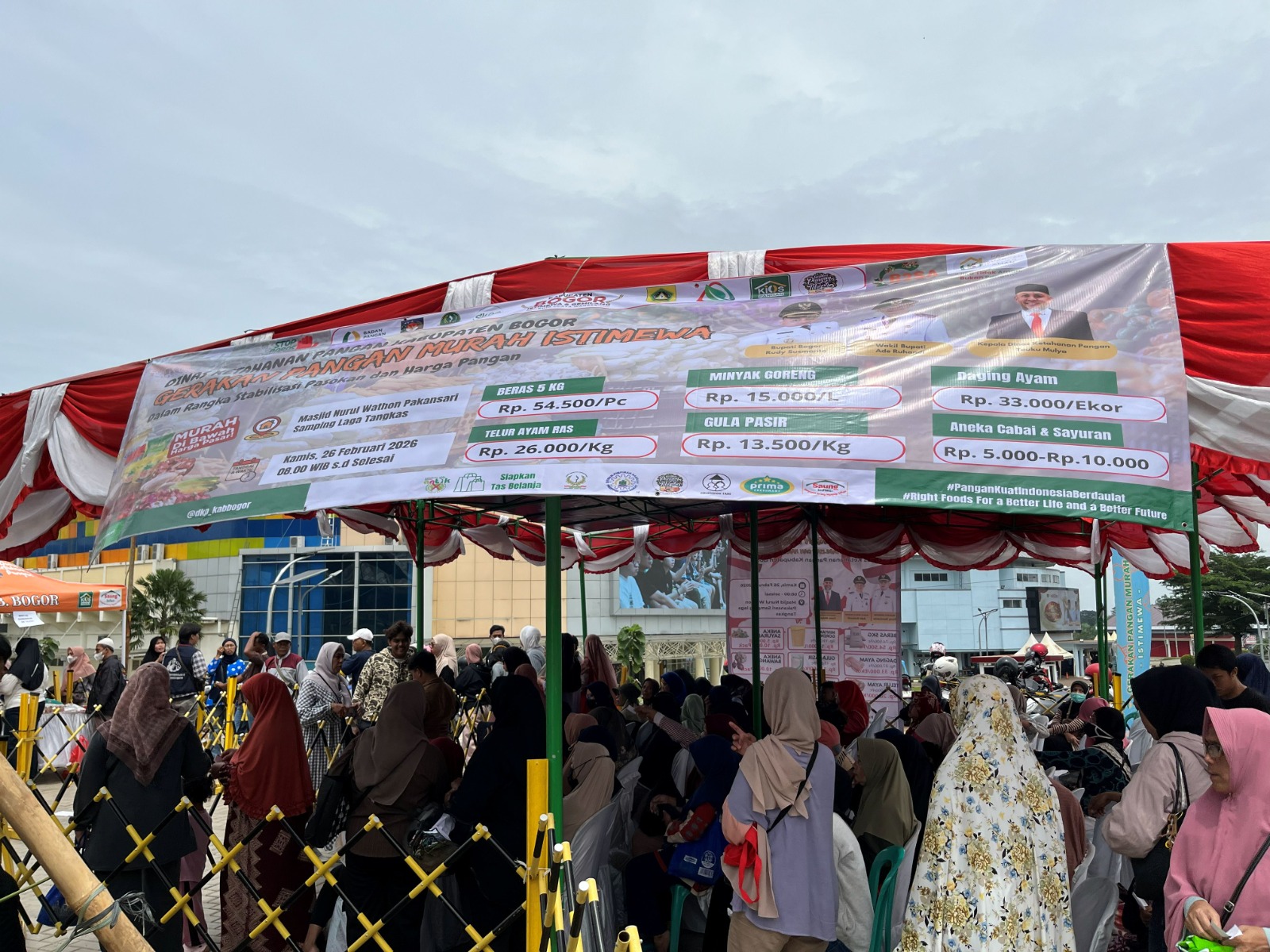 CIBINONG - Pemerintah Kabupaten Bogor melalui Dinas Ketahanan Pangan Kabupaten Bogor kembali menggelar Gerakan Pangan Murah (GPM) Istimewa di sekitar Masjid Nurul Wathon, Cibinong, Kamis (26/2). Kegiatan ini dilaksanakan sebagai upaya membantu masyarakat mendapatkan bahan pangan pokok dengan harga lebih terjangkau sekaligus menekan laju inflasi menjelang Hari Besar Keagamaan Nasional (HBKN).