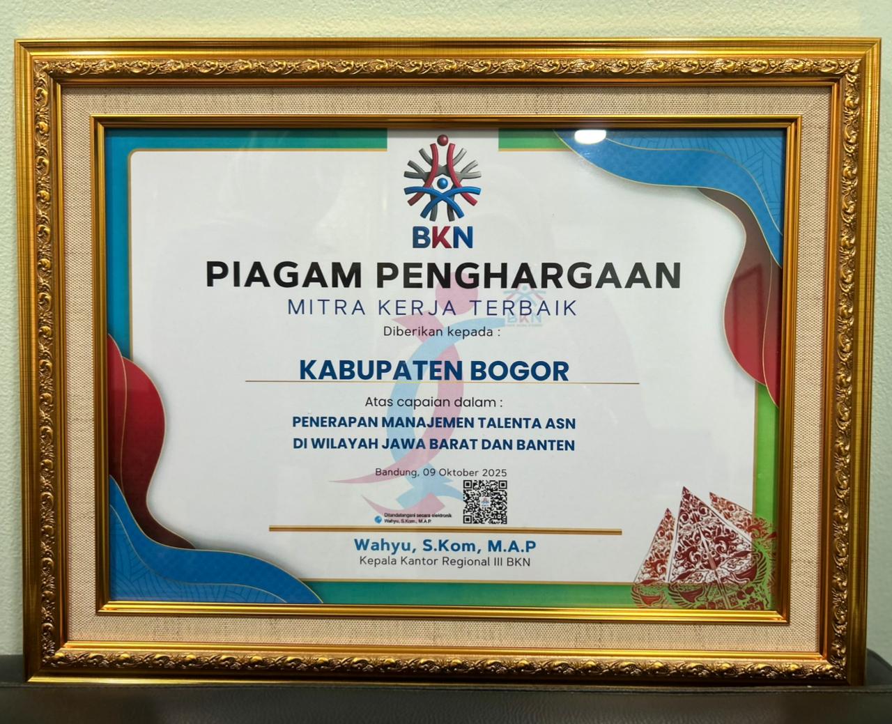 Penghargaan tersebut ditetapkan oleh Kepala Kantor Regional III BKN dan diserahkan pada 9 Oktober 2025 di Bandung.