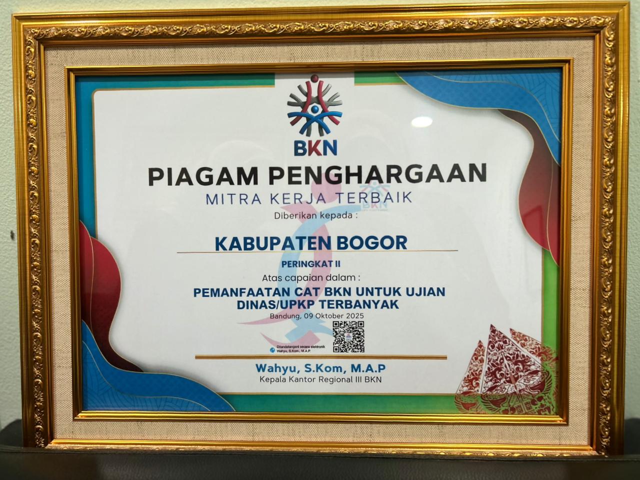 Penghargaan pertama diraih sebagai Mitra Kerja Terbaik Peringkat II dalam pemanfaatan Computer Assisted Test (CAT) BKN terbanyak untuk pelaksanaan Ujian Dinas dan Ujian Penyesuaian Kenaikan Pangkat (UPKP). Capaian ini menunjukkan komitmen Pemkab Bogor dalam menerapkan sistem seleksi dan pengujian Aparatur Sipil Negara (ASN) yang objektif, transparan, dan akuntabel.