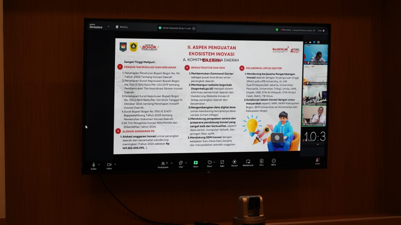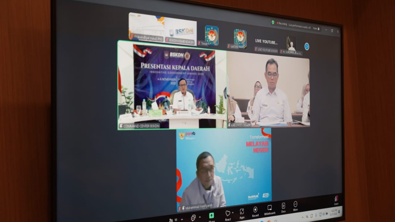 Cibinong – Mewakili Bupati Bogor, Sekretaris Daerah (Sekda) Kabupaten Bogor, Ajat Rochmat Jatnika, mempresentasikan dua inovasi unggulan Pemerintah Kabupaten Bogor dalam tahapan penilaian presentasi Kepala Daerah pada ajang Innovation Government Awards (IGA) Tahun 2025 yang diselenggarakan oleh Kementerian Dalam Negeri. Presentasi tersebut dilaksanakan secara daring pada Rabu (5/11/2025).