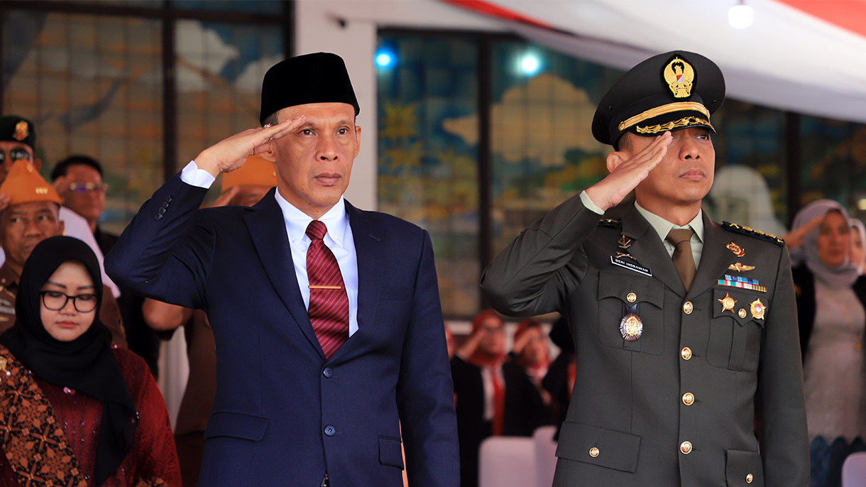 Cibinong, Kompim – Pemerintah Kabupaten Bogor menggelar upacara peringatan Hari Kesaktian Pancasila secara khidmat di Lapangan Tegar Beriman, Rabu (1/10/2025) pagi. Upacara yang dipimpin langsung oleh Bupati Bogor, Rudy Susmanto, ini turut dihadiri oleh Wakil Bupati Bogor, jajaran Forum Koordinasi Pimpinan Daerah (Forkopimda) serta seluruh unsur pimpinan dan aparatur di lingkungan Pemkab Bogor.