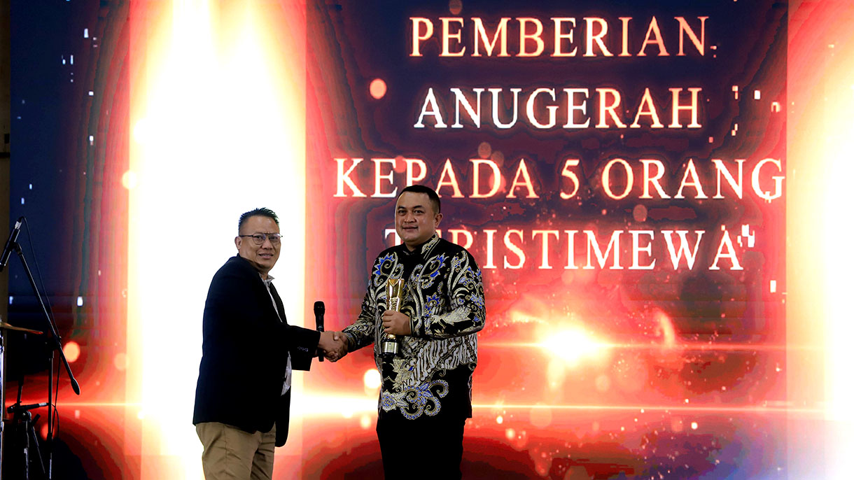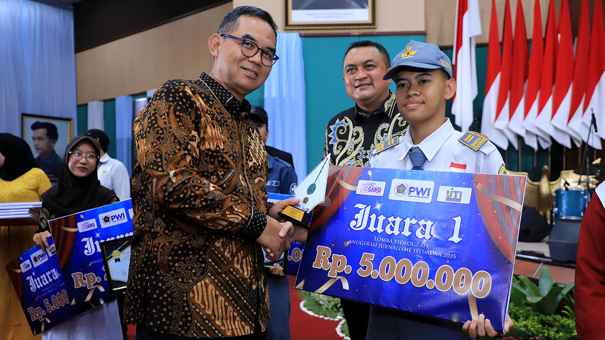 Cibinong, Kompim – Bupati Bogor, Rudy Susmanto, menerima penghargaan sebagai kepala daerah yang dekat dan peduli kepada insan pers, khususnya PWI Kabupaten Bogor, dalam Malam Anugerah Jurnalisme Istimewa 2025 di Gedung Tegar Beriman, Senin (1/12/2025). Penghargaan ini menandai apresiasi atas sinergi dan dukungan kuat Bupati terhadap perkembangan jurnalisme di Bumi Tegar Beriman.