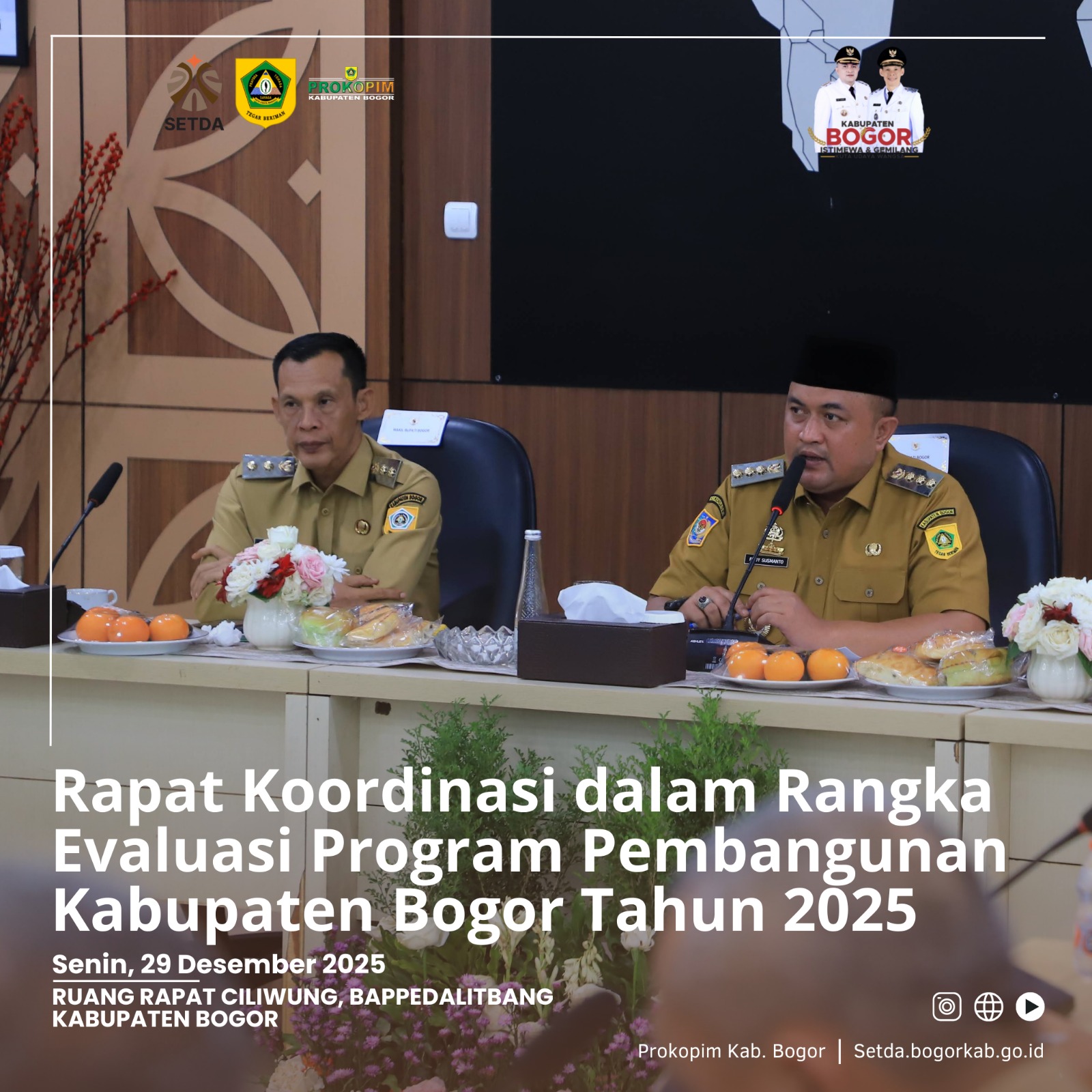 CIBINONG — Bupati Bogor, Rudy Susmanto menegaskan bahwa kekompakan Aparatur Sipil Negara (ASN) merupakan kunci utama keberhasilan pembangunan di Kabupaten Bogor. Hal tersebut disampaikan Rudy Susmanto dalam sambutannya kepada jajaran perangkat daerah Pemerintah Kabupaten Bogor. Demikian disampaikan Rudy pada rapat koordinasi rangka evaluasi program pembangunan Kabupaten Bogor tahun 2025, di Ruang Rapat Ciliwung-Bappedalitbang, Cibinong, Senin (29/12).