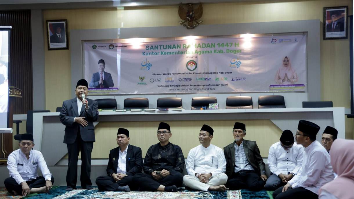 Cibinong, Kompim – Pemerintah Kabupaten Bogor menegaskan komitmennya dalam memperkuat nilai-nilai spiritual sebagai fondasi pembangunan daerah. Hal ini mengemuka saat, Ajat Rochmat Jatnika, Sekretaris Daerah Kabupaten Bogor menghadiri penutupan kegiatan "1.000 Kali Khatam Al-Qur’an Ramadan 1447 H" di Aula Kantor Kementerian Agama Kabupaten Bogor, Selasa (10/3/2026).